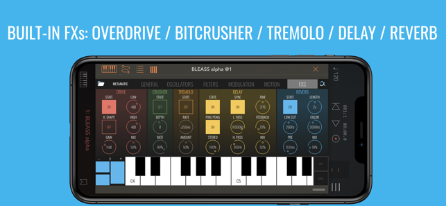 CPU EFFICIENT: how many times have you experienced crackling sounds while making music in the studio or on stage? The BLEASS Alpha Synth aims at offering a smooth & steady experience on iPhones and iPads, whether used as standalone or as an Audio Unit (AUv3) into your favorite DAW.