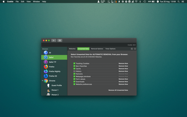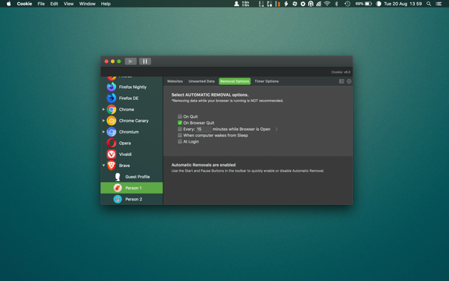 - A number of removal schedules are possible: When quitting Cookie, when a Browser is Quit, on computer login, On computer waking from sleep, on a customizable time schedule, or entirely manually.
