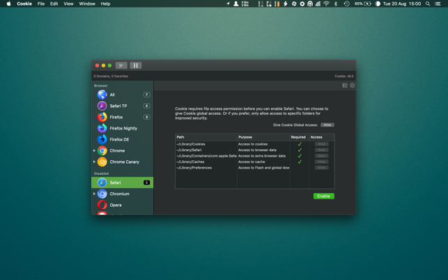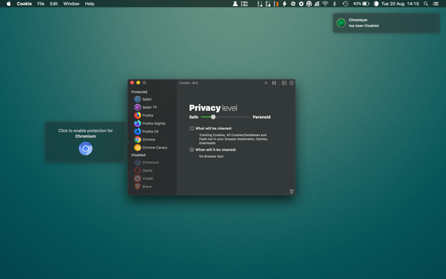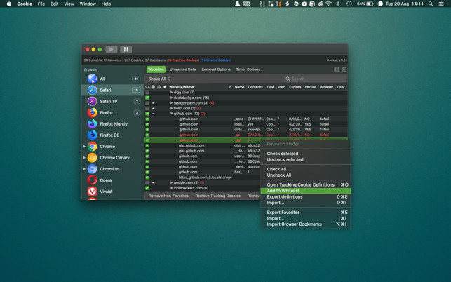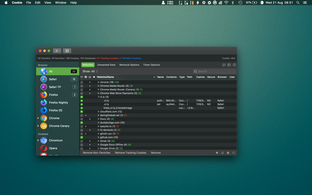 Cookie has replaced the myriad of different cookie cleaners I used in each browser and provides me a single interface to maintain the privacy I desire on the web. For newbie's to the app, use the default setup and as you gain confidence, it's easy to switch to the more advanced interface -- e.g. After the first few hours with the app, I now keep only data for a few websites I trust, and then specifically userid/password cookies from other forums I frequent that are generally plagued with trackers and the like -- Cookie automatically deletes everything else each and every time I exit the browser without my having any further concern -- a perfect scenario for my needs.