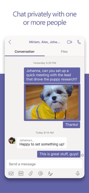 * Chat privately or in groups, and communicate with the entire team in dedicated channels