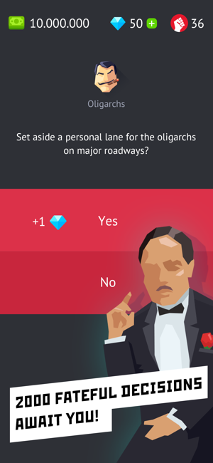 I have encountered 2 main problems so far and assume to find more. 1 money is way to hard to get I your source of getting money makes no sense and gives next to nothing I have had to watch many ads just to keep my game going to add to this so many decisions cost money when they have absolutely no reason to for example when one of the groups asks for something you can expect it to cost money but for some reason even if you say no you still lose money somehow and this happens all the time for many different senarios(2 you choices have results that make no sense about 70% of my choices had outcomes that made no sense and were only made to balance the choice not make it realistic for example the police asked for a wine cooler in the court room for some reason I said yes somehow this angered the military and a few others I don’t understand how this has noting to do with the military. Overall great game concept but it has so many issues and I am sure I will find more right after I am done writing this also ur a legend if you actually took the tune and read all this.