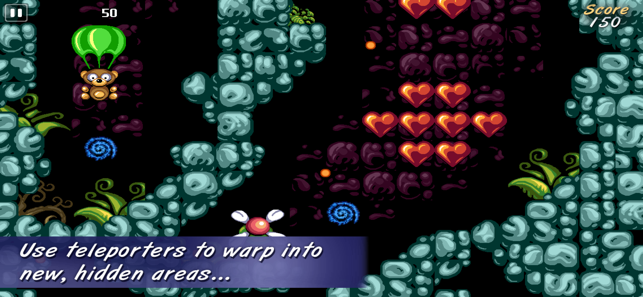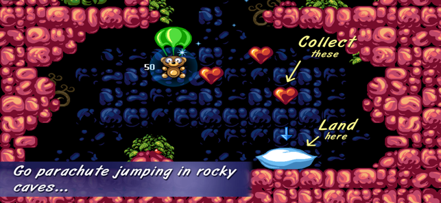 Jump down the rocky caves of Fuzzy Land and aim for the fluffy pillow at the bottom of each cave, all while collecting hearts and trying not to snap the chute.