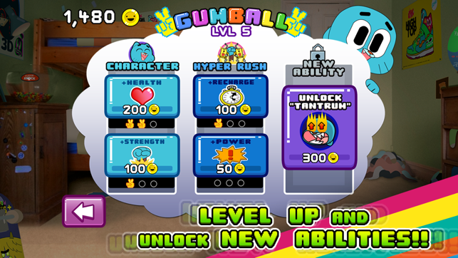 Switch between Gumball, Darwin, and Anais to defeat swarms of mutant food. Each character has his or her own special abilities. Gumball throws a rampaging temper tantrum; Anais uses the power of Daisy the Donkey to heal her teammates; and Darwin uses a bubble shield to block attacks.