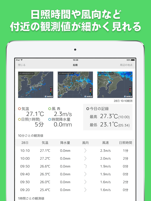 ・ページ下部の観測記録をタップすると、最寄りのアメダスの10分単位の観測記録、雨雲の動き(レーダー)を見ることができます。