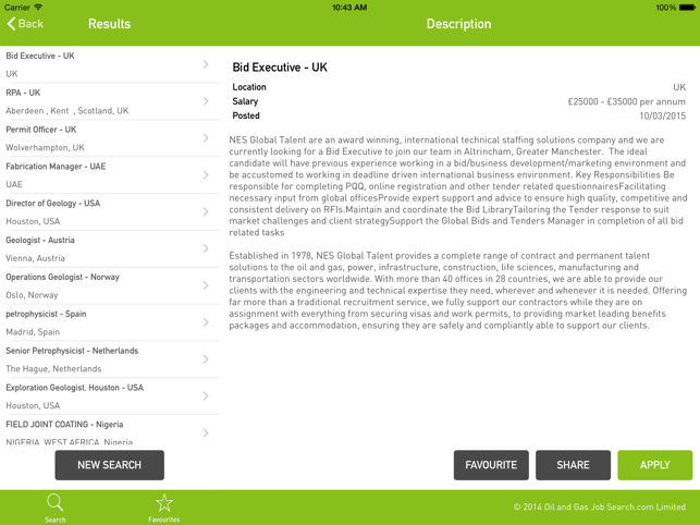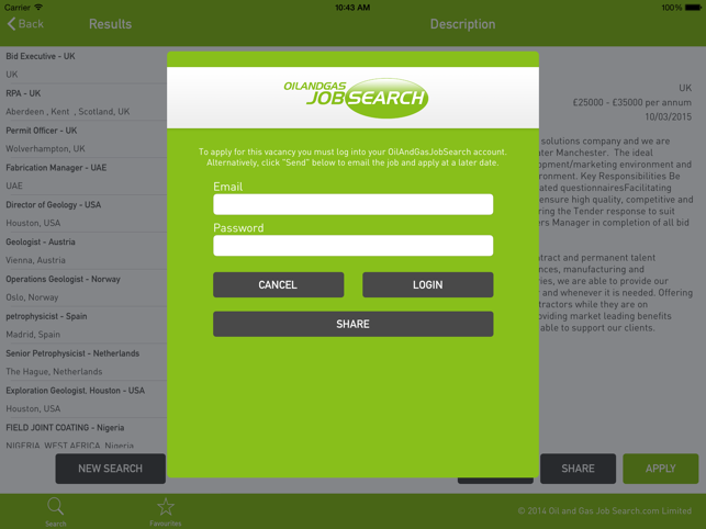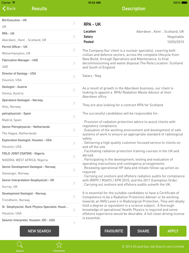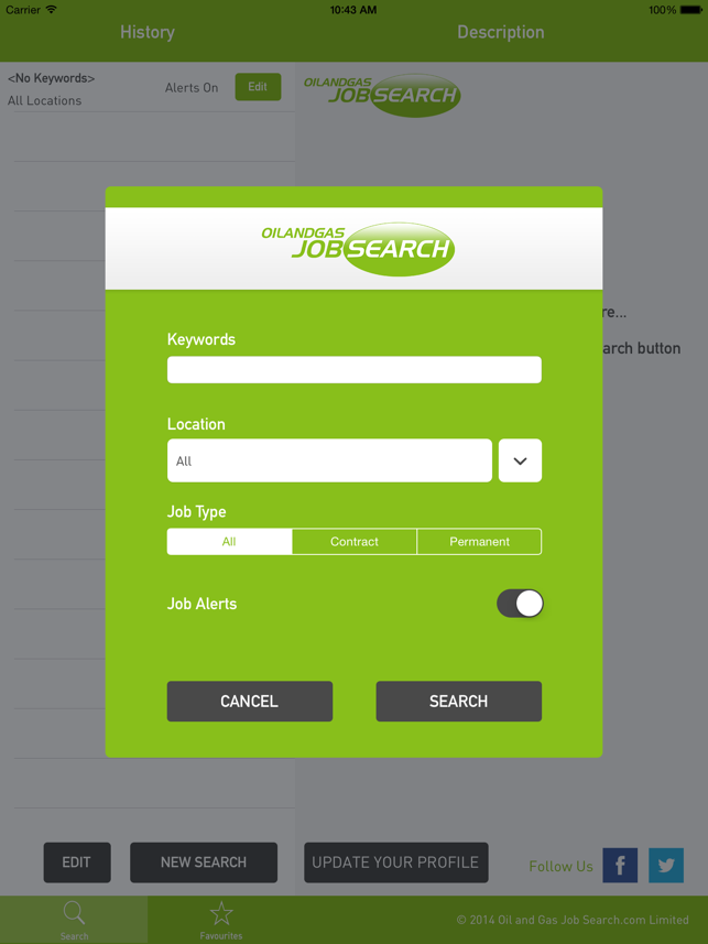 Connect to the world’s premier oil and gas industry job site! Discover and apply for jobs that match your exact criteria. Get the OILANDGASJOBSEARCH app for iPad, which allows you to search, view and apply for jobs on www.oilandgasjobsearch.com. You will even be alerted when jobs that match your searches become available!