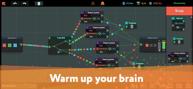 Drag objects around your screen with a mouse! Connect them with lines (oh yeah)! Try. Fail. Optimize. Try again. Then press “Release” button and see that sweet pieces of data flow smoothly through your screen.