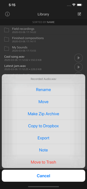 You can record directly in the app, from microphone, external audio interfaces, Inter-App Audio, or other Audiobus compatible apps. Preview and play soundfiles with waveform display and looping, trim and normalize soundfiles, and convert to other file formats such as M4A AAC or ALAC (Apple Lossless), WAV, AIFF, CAF with options for bit rate or bit depth and sample rate.