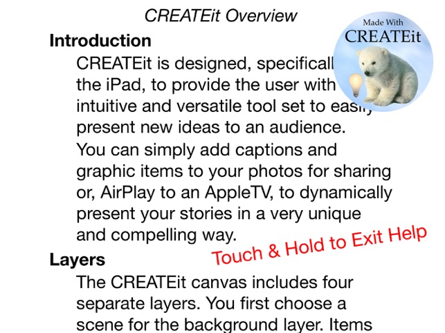 CREATEit Pro is designed, specifically for the iPad, to provide the user with an intuitive and versatile tool set to easily present new ideas to an audience visually. You can simply add captions and graphic items to your photos for sharing or, AirPlay to an AppleTV, to dynamically present your stories in a very unique and compelling way.