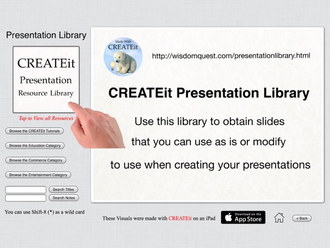 Think of it as HyperCard for the iPad. CREATEit combines features from PowerPoint, PhotoShop, and Director and uses a simple flash card metaphor to provide you with a new creative tool and a new platform to share your ideas and wisdom.