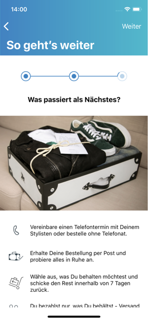 Wähle einen Telefontermin für ein persönliches Gespräch oder bestelle gleich online Deine Box. Dann stellt Dir Dein Stylist ein individuelles Outfit zusammen und schickt es Dir zu. Dieser Service kostet nichts!