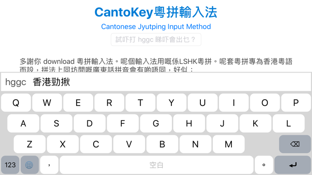 Keyboard for LSHK Jyutping (the standard for Cantonese transcription/spelling since 1993), with word/phrase-level input and collocation support.