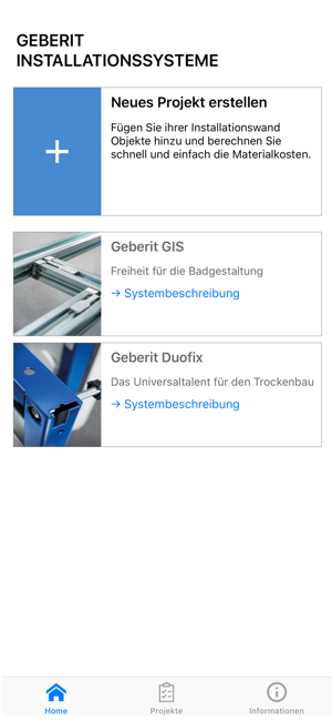 Mit der Geberit Installation Systems App planen Sie die Vorwandsysteme Geberit GIS und Duofix einfach, schnell und effizient. Erstellen Sie in wenigen Schritten eine Materialliste und berechnen Sie die Materialkosten Ihres Projekts.
