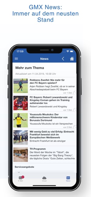 Die GMX Mail App unterstützt neben Mail jetzt auch GMX News und das GMX MediaCenter.