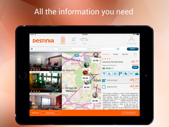 For each hotel, the app provides you with a description of the services, photos and a map so you’ll know where it’s located.