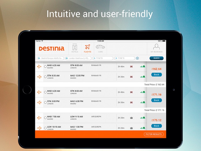 When searching for flights, the app allows you to filter the results by departure time, flight duration and you can see if the fare includes luggage and an indicator of how many seats are available.