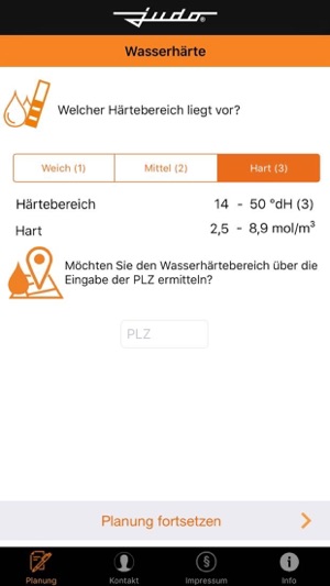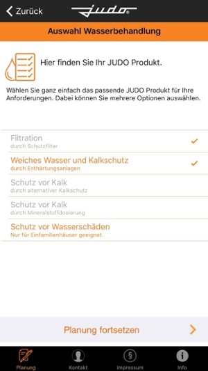 Ausgehend von der Problemstellung des Kunden führt Sie die App durch die verschiedenen Schritte der Planung – von der Abfrage der Wasserhärte, der verbauten Rohrmaterialien in der Installation und der Anzahl der Wohneinheiten bis zur Wahl des Wasserdurchflusses.
