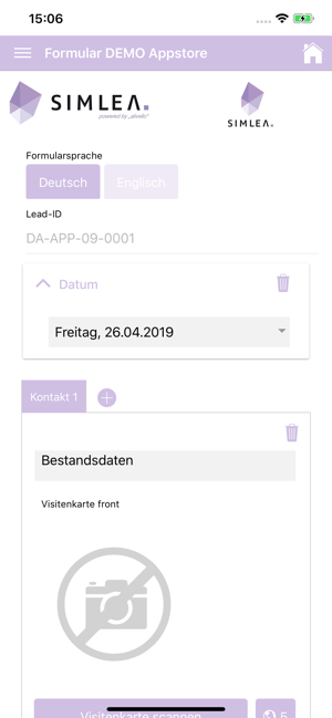 SIMLEA Lead App zur mobilen Erfassung von Messeleads oder Außendienst Besucherberichten über eine mobile Lead App für Tablets oder Smartphones. Individuell konfigurierbare Formulare, die online und offline Daten mittels OCR Erkennung in bis zu 27 Landessprachen erfassen und in Echtzeit zur Verfügung stellt. SIMLEA ist multilingual einsetzbar und stellt den Zugriff auf die erfassten Daten GDPR/DSGVO konform binnen Sekunden sicher. Optional mit CRM Anbindung.