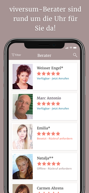Jetzt viversum-app downloaden und sofort mit ihrem persönlichen Kartenleger, Hellseher, Wahrsager oder Astrologen in Kontakt treten!