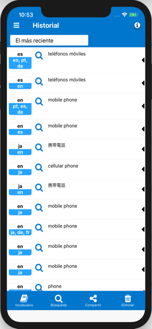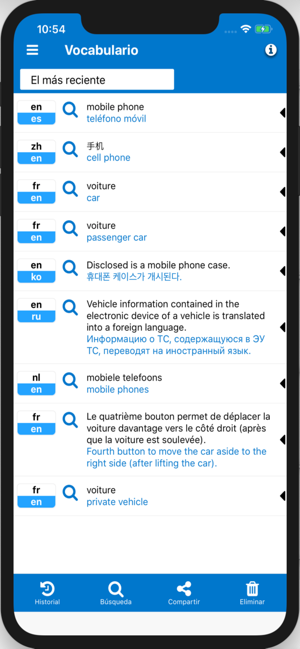 Guarde su historial de traducción en lenguas extranjeras. Enriquecer sus conocimientos del idioma por el ahorro de su vocabulario traducción favorita en su libro de vocabulario de traducción.