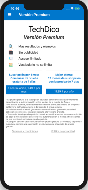 - La prueba gratuita o la suscripción se puede cancelar en cualquier momento desactivando la autorenovación en los ajustes de la cuenta de iTunes. Per evitare addebiti, tale disdetta dovrà essere effettuata almeno 24 ore prima del termine dell'abbonamento o del periodo di prova gratuita. La disdetta avrà effetto il giorno successivo all'ultimo giorno del periodo di abbonamento in corso, e sarai declassato alla versione gratuita.