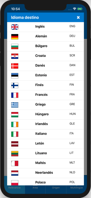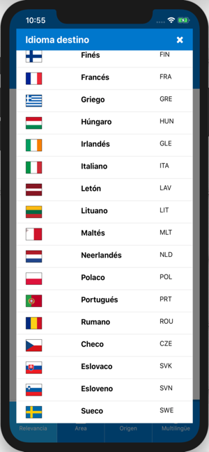 francés, alemán, portugués, italiano, rumano, neerlandés, polaco, griego, danés, sueco, finés, irlandés, maltés, esloveno, lituano, estonio, eslovaco, húngaro, letón, búlgaro, checo, croata, japonés, coreano, chino, ruso