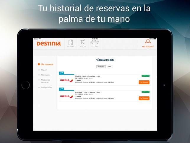 Regístrate y podrás tener acceso a un panel de control para gestionar tus próximas reservas: consultar el estado de cada una, contactar con el gestor personal asignado, ver la documentación (billete y bonos) de todas tus reservas hechas con nosotros (no sólo en hoteles y en vuelos).
