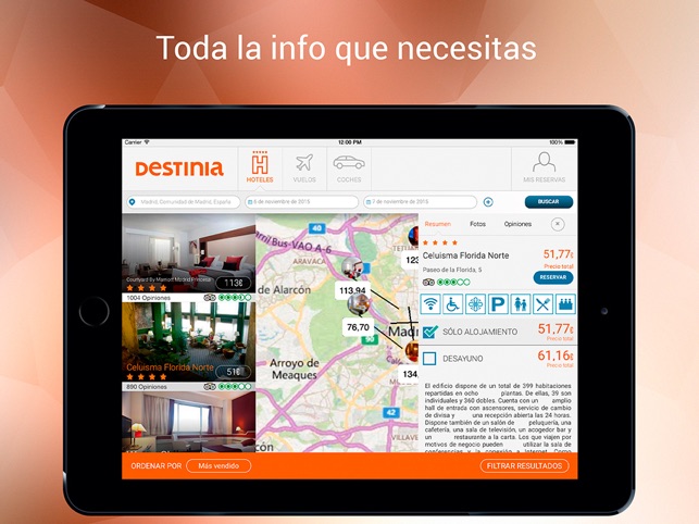 La app pone en tu mano una descripción de los servicios de cada hotel, fotos y un mapa para que sepas dónde se ubica.