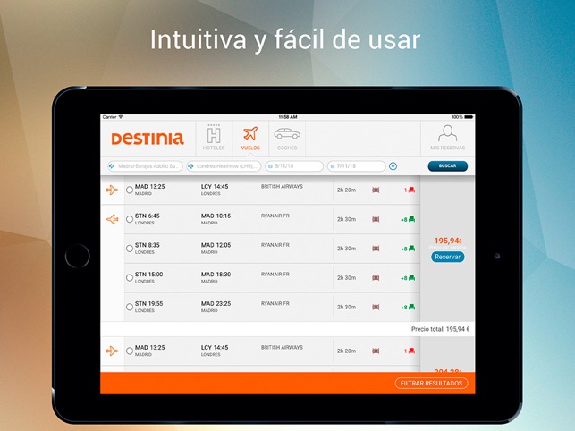 En vuelos, la app te permite filtrar y así buscar ofertas por horario, duración del viaje, compañía, aeropuerto o en función de si quieres o no hacer escalas.