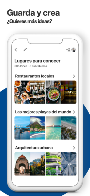 • Agregar Pines desde tu navegador móvil: guarda las buenas ideas que encuentres en la Web.