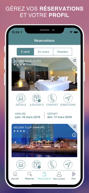 Découvrez notre toute nouvelle application hôtelière pour gérer et organiser vos prochains séjours, qu’il s’agisse d’un voyage d’affaires, de vacances ou d’un week-end avec votre famille ou entre amis. Comparez les hôtels et réservez votre prochain séjour en toute simplicité, et au meilleur tarif.