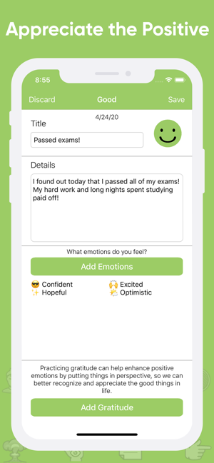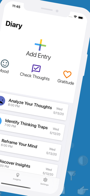 You can use this app as a mood journal, a thought record journal, and a gratitude journal all in one!