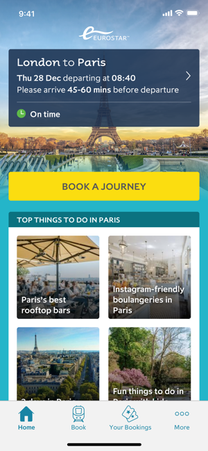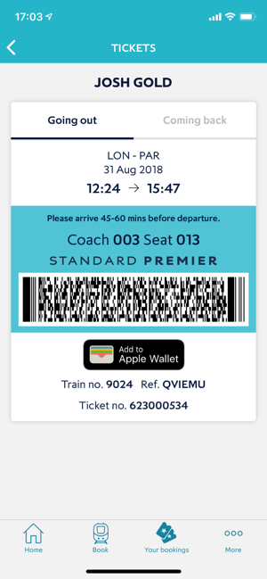 Really recommend this app. I am going to France and I just wanted to have our tickets on another device to be safe and I didn't have to log in by clicking "continue as guest" and all I had to do was enter my booking reference number and my last name and my tickets were on the screen with the barcode and everything! When I do get there, all I have to do isn ouch the device with the scanner and I can go to France! It has a really easy way of booking your tickets as well.
