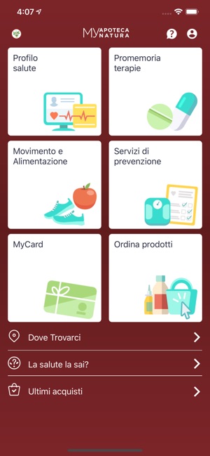 Inoltre in ogni momento potrai trovare la Farmacia Apoteca Natura più vicina a te, ricevere notifiche su servizi di prevenzione a attività collegate al tuo benessere e giocare a “La salute la sai?” il quiz per imparare giocando come vivere in salute.