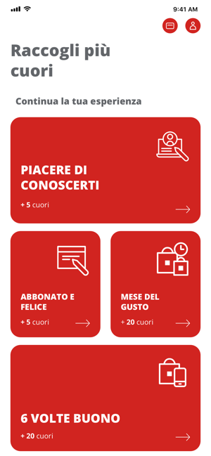 Le sorprese non finiscono più. Il programma prevede una serie di esperienze di gusto che consentono di guadagnare ulteriori cuori, diventando più velocemente Master o Ambassador e accedendo a vantaggi sempre più esclusivi: regali, promozioni, acquisti a condizioni privilegiate, biglietti per eventi imperdibili e non solo.