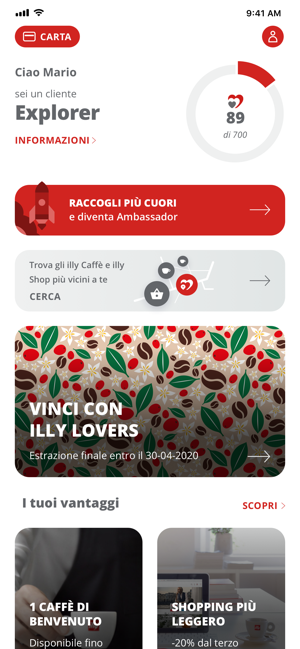 L’applicazione ufficiale illy nasce per riconoscere vantaggi esclusivi a chi ha scelto di essere fedele all’eccellenza del caffè. Scaricando la app si entra a far parte di un vero percorso di gusto: ogni acquisto su illy.com, negli illy Caffè o negli illy Shop consente di guadagnare cuori e diventare Explorer, Master o Ambassador, accedendo a un mondo di esperienze.