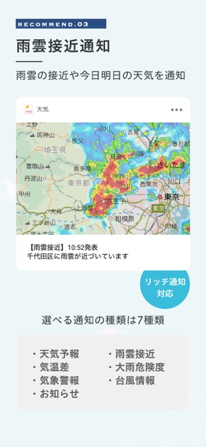 雨雲が接近すると通知してくれる機能があり、おかげで洗濯物のとりこみがギリギリ間に合った!ということが何度もあります。