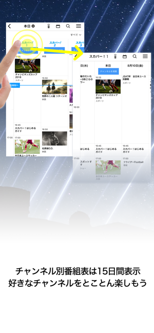 番組表ではチャンネル別の15日間番組表に対応。お好みのチャンネルに絞って、見逃し配信の再生や今後の番組を探しやすくなっています。