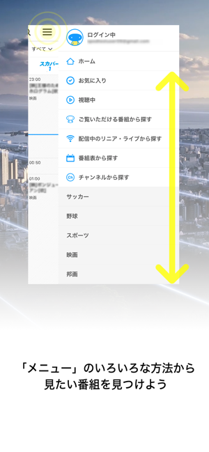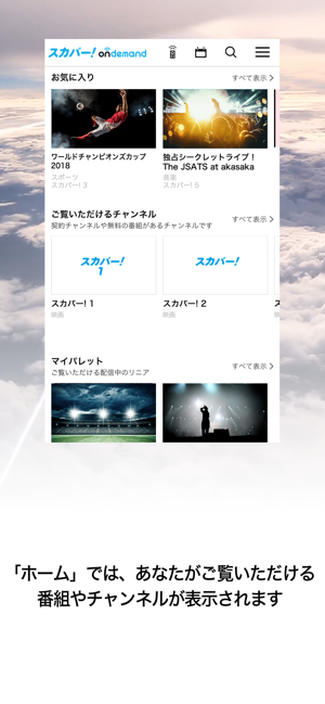 スカパー!オンデマンドでは、多くのチャンネルのリアルタイム配信や、ライブ番組、ライブを見逃した方のための見逃し配信、数多くのビデオ作品を配信しています。