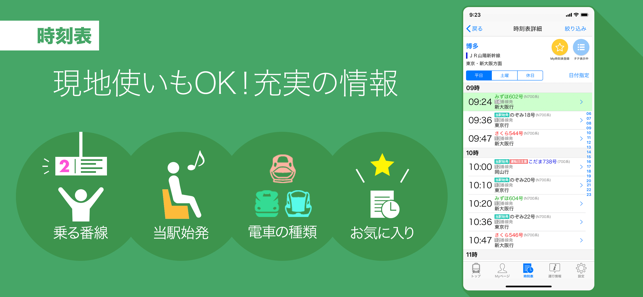 ・種別や行き先の絞り込みができます。「のぞみ」「はやぶさ」などの新幹線名や、「快速」「通勤急行」など特定の種別、途中駅止まりを省いた時刻表が表示できます。そのままオリジナルの時刻表としてMy時刻表登録できます。