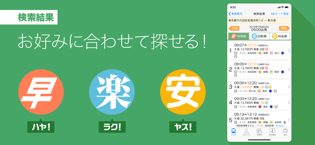 ・「早い順」「安い順」「乗換回数が少ない順」を選べます。