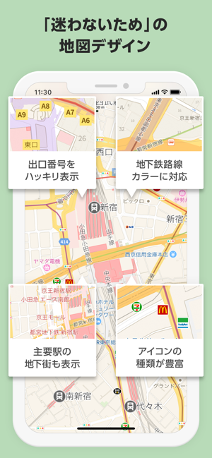 ・主要駅の地下街も表示。階ごとの地図表示で楽に移動できます。