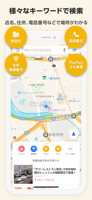 ・かんたんスポット検索:アイコンをタップするだけで近くのお店が見つかる!