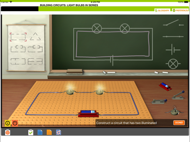 Using 3D graphics and 2D electronic symbols, you will assemble different types of series circuits using wires, switches, batteries, and light bulbs. In order to better understand the difference between a series and a parallel circuit, build a circuit that illuminates two bulbs and observe what happens when one light bulb is removed.