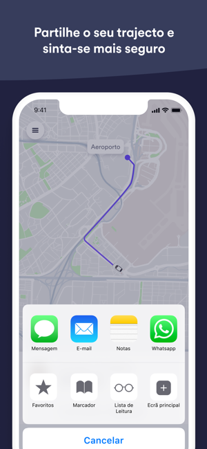 - Segurança para si e para os seus. Todas as viagens estão geolocalizadas e podem ser partilhadas imediatamente com qualquer familiar ou amigo. Desta forma poderão saber em que carro, com que motorista e em que ponto você está.