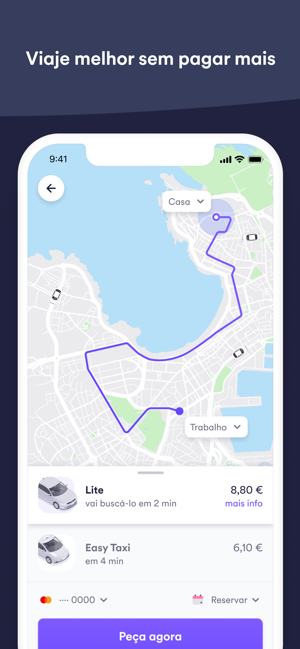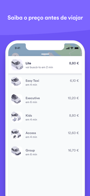 1. Reserve ou peça a sua viagem. Abra a app e indique onde está. Selecione qual é o seu destino e com que tipo de veículo quer viajar: Lite, Baby, Group, etc. Descubra as opções disponíveis na sua cidade.
