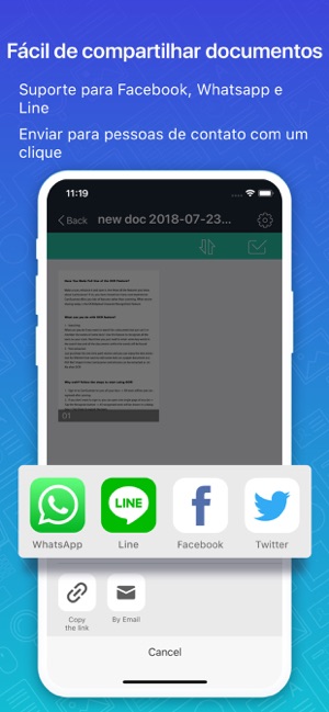 Partilhe facilmente documentos no formato PDF ou JPEG com os seus amigos através de várias formas: post nas redes sociais, envio de anexos ou link para o download dos documentos através de e-mail.