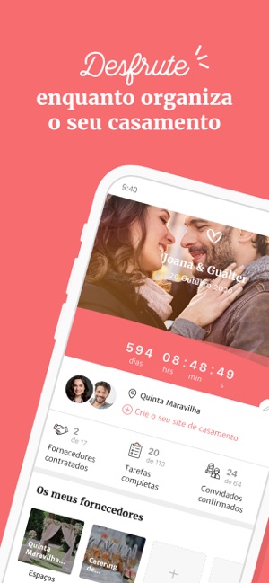 • Ferramentas super úteis: Checklist de tarefas, countdown dos dias que faltam para casar, o meu organizador de convidados e de convites online, o meu organizador de mesas, o meu orçamentador