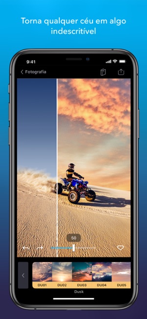 Transforma o céu em segundos (em comparação com o tempo dispendido nos editores de computador!). Escolhe entre uma mistura de céus que inclui tonalidades de amanhecer, energia de meio-dia, nasceres do sol vívidos e noites desertas. Dá cor ou muda a cor do céu, adiciona nuvens ou move-as para sugerir vento.