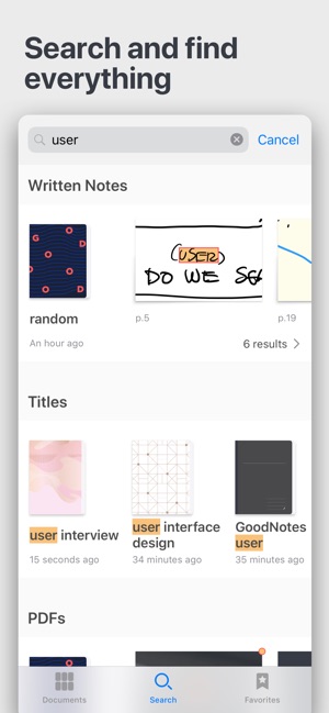 Tap the + button in the library or in the document navigation bar to open your device's camera and use it to scan paper documents. GoodNotes recognizes printed text in all Latin-based languages, making it searchable.