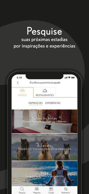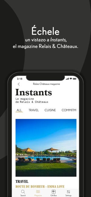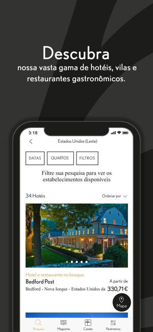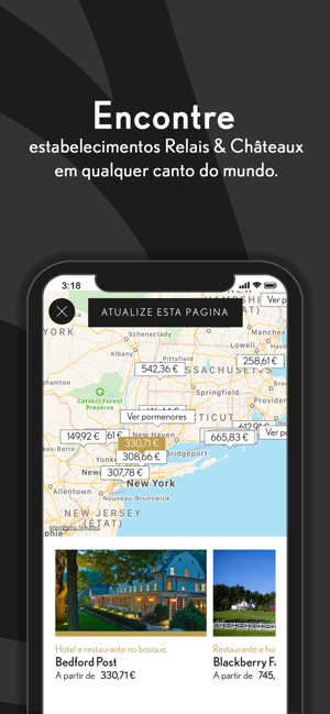 O aplicativo Relais & Châteaux oferece imersão total em nossos hotéis e restaurantes com listas de resultados detalhadas e fichas que colocam em destaque imagens dos estabelecimentos e permitem que você conheça os proprietários, chefs e experiências inesquecíveis que estão à sua espera.